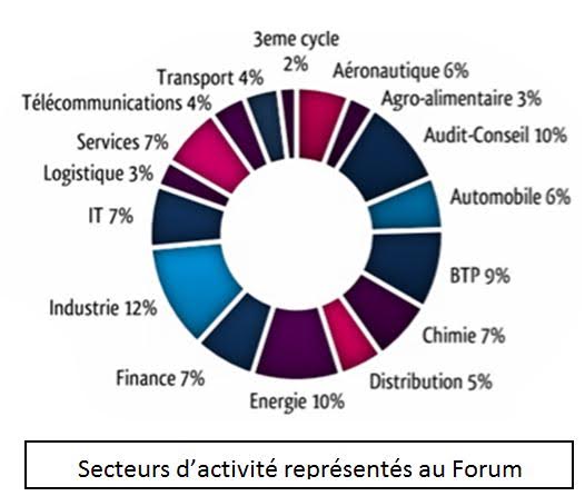 Pour les étudiants et les jeunes diplômés, c’est la meilleure occasion de rencontrer des entreprises issues de secteurs d’activité très divers. En effet, nos entreprises participantes couvrent la grande majorité de l’activité actuelle : BTP, Banque, Informatique, SSII, Industrie, Distribution, Audit Conseil, Service… (cf. graphe ci-contre). Quant aux entreprises, elles peuvent recruter des étudiants de qualité, mais aussi avoir une meilleure visibilité, en particulier en proposant des conférences sur leurs différents métiers, des analyses de CV ou des simulations d’entretiens.